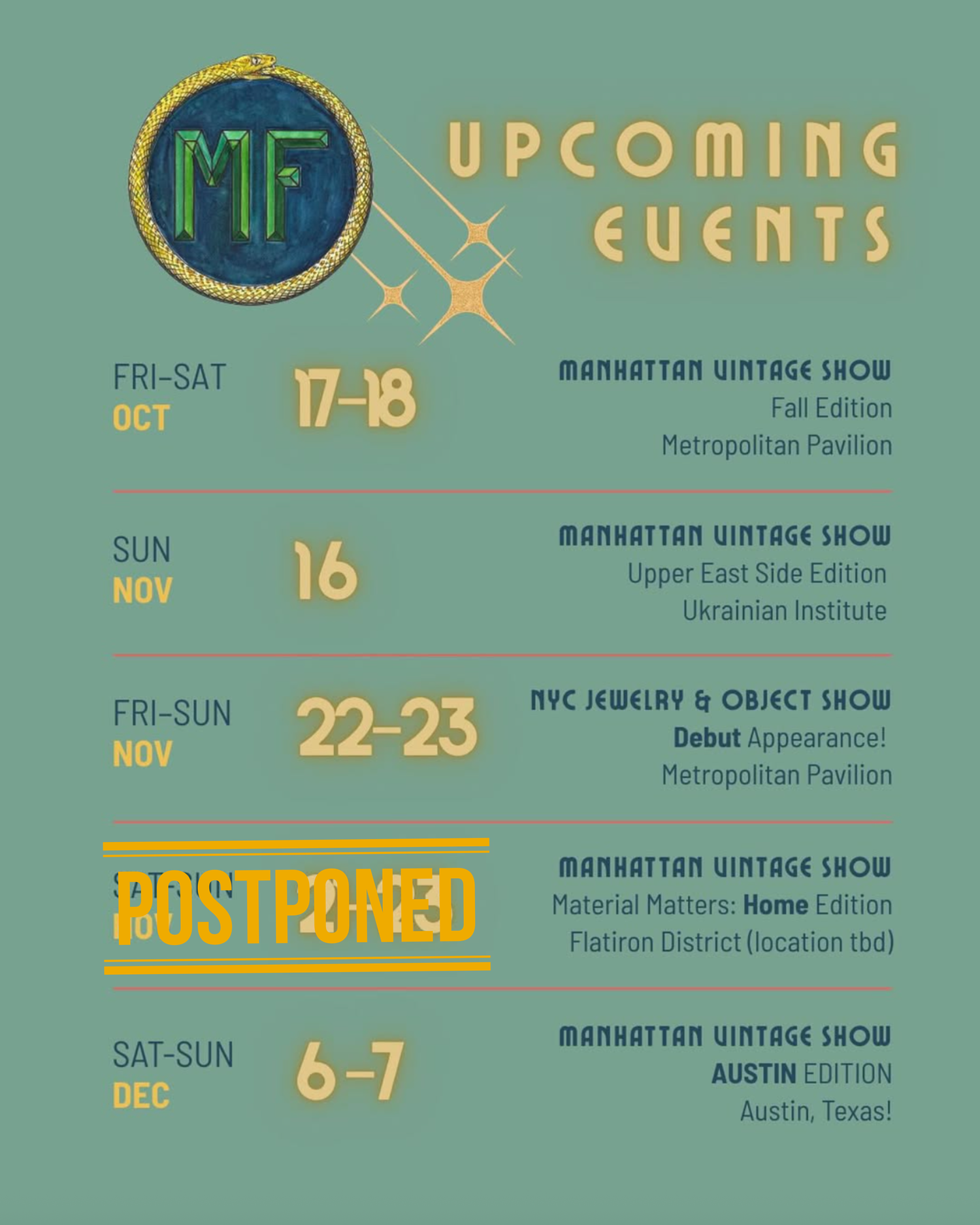 We have an exciting season ahead, and for those who love discovering treasures in person, here is where you can find us. Madame Fortuna will be showcasing at a series of can’t-miss events across New York and beyond. We will begin at the Manhattan Vintage Show: Fall Edition at the Metropolitan Pavilion on October 17 and 18, followed by the Upper East Side Edition at the Ukrainian Institute on November 16. Next comes our debut appearance at the NYC Jewelry and Object Show at the Metropolitan Pavilion on November 22 and 23. Finally, we will head south for the Manhattan Vintage Show: Austin Edition on December 6 and 7 in Austin, Texas. Our Narrowsburg shop will remain open throughout the season, but if you are near one of these cities, come experience the magic of Madame Fortuna in person.