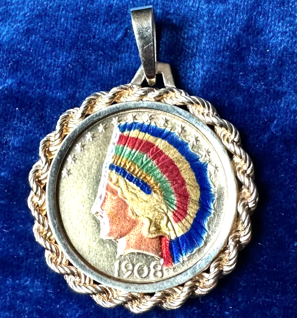 Cette incroyable pièce d'or « Sans Devise » de 1908, représentant une Tête d'Indien, est en or finesse .900 (21 carats) et sertie d'une bélière en or 14 carats. Son incroyable émaillage translucide date du début des années 1900. Certainement avant 1920, date à laquelle fut promulguée une loi interdisant la « mutilation délibérée » des pièces ou leur utilisation à d'autres fins que la monnaie. Imaginez interdire cette beauté !